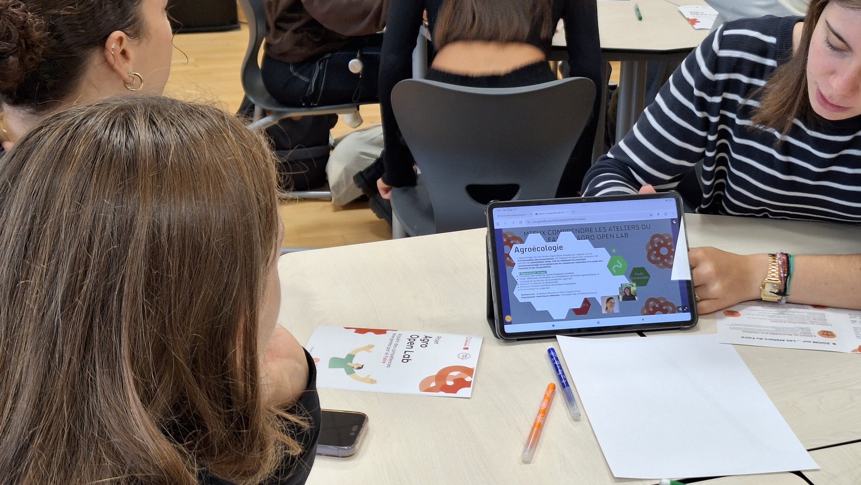 Angélique Vannier et Marion Barthes leur ont présenté les dispositifs à travers une expérience interactive : panoramas des projets étudiants, objets réalisés dans les ateliers (bières du BubbleLab, emballage du PackLab, prototypes du TechNum…), et un jeu d’idéation pour introduire la Fabrique des Idées.